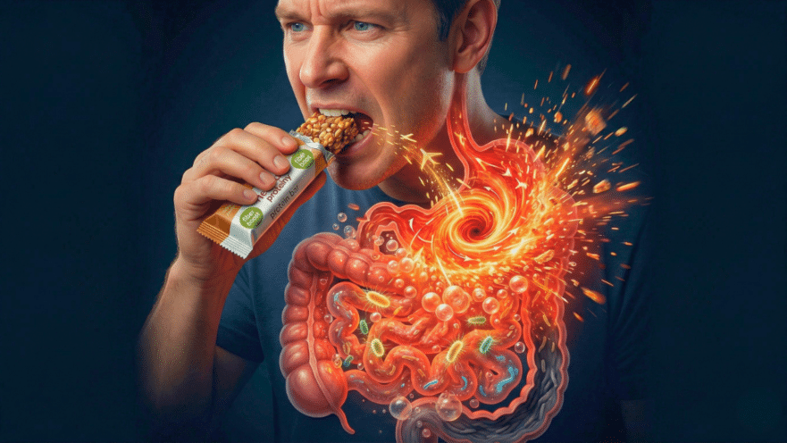 Second, the fiber ferments too fast and in the wrong place. This is a huge problem. Whole-food fiber is complex and breaks down slowly as it travels through your digestive system, with most of the fermentation happening in the large intestine where it belongs. Refined fiber, however, is already broken down. It hits your small intestine and starts fermenting rapidly. We don’t want a lot of bacteria or fermentation in the small intestine. When this happens, it leads to a condition called Small Intestinal Bacterial Overgrowth, or SIBO. The classic symptoms are bloating, gas, abdominal pain, and discomfort, which many people experience after eating a high-fiber protein bar.