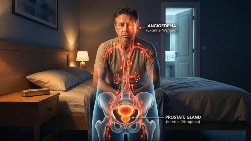 Alongside urticaria, some men can develop angioedema: sudden, sometimes severe swelling of the lips, tongue, cheeks, or even around the eyes. This can look dramatic, and can happen out of the blue.