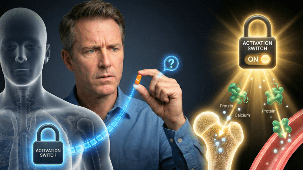 You’ve probably heard the common narrative: calcium hardens your arteries, and vitamin K2 tells that calcium where to go. Therefore, taking K2 should prevent calcification and shuttle calcium back into your bones where it belongs. And to be fair, that story isn’t entirely wrong. Vitamin K2 is essential for activating two key proteins. The first is Matrix GLA Protein (MGP), which acts like a security guard inside your blood vessel walls. When activated by K2, MGP binds to free-floating calcium and prevents it from settling and hardening in your arteries. The second is osteocalcin, a protein that signals your bone tissue to absorb and integrate calcium, making your skeleton stronger.