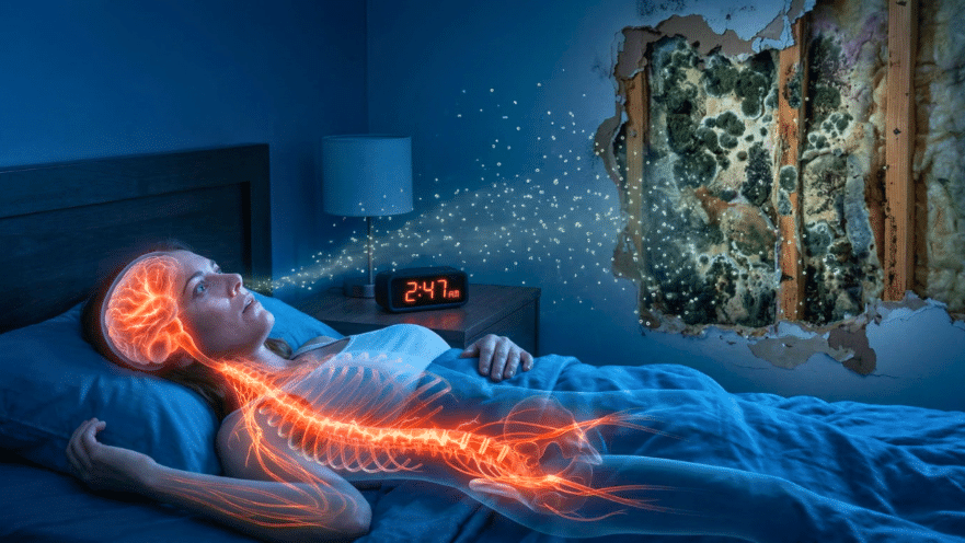 Do you feel exhausted all day but find yourself wide awake the moment your head hits the pillow? Mold toxicity can throw your entire sleep-wake cycle into disarray. Many people experience severe insomnia, either having difficulty falling asleep, waking up multiple times throughout the night, or waking up far too early and being unable to fall back asleep. Another strange symptom is the new onset of night sweats, even when you’re not going through menopause. This happens because mycotoxins directly affect your autonomic nervous system (ANS). The ANS is the master controller of your body’s automatic functions, balancing your “fight-or-flight” response with your “rest-and-digest” mode. Mold pushes your body into a constant state of “fight-or-flight,” leaving you feeling wired but tired. Your brain can’t shut off, your heart rate may be elevated, and you feel a persistent sense of anxiety, all while your body is screaming for rest.